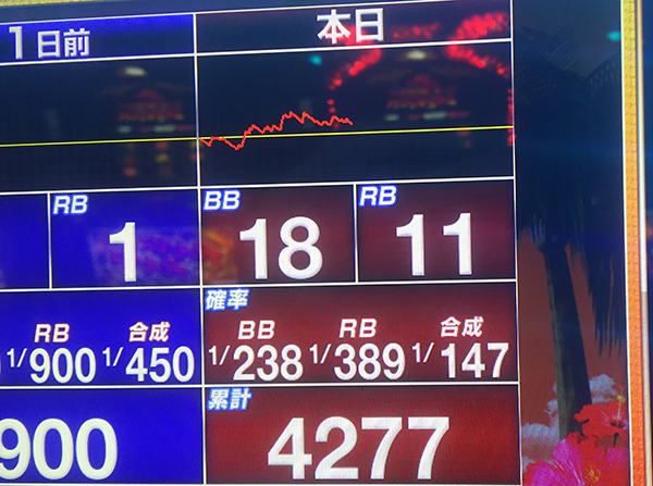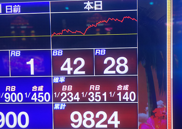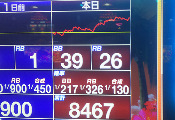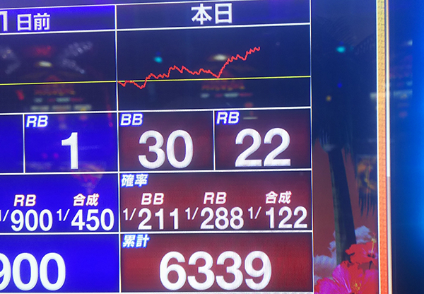 4600Gを過ぎた頃からはボーナス合算確率が設定6の数値を上回り、消化ペースはダウン。ボーナスの連打に苦戦する状況が続き、18時頃にようやく6300Gを通過していた。