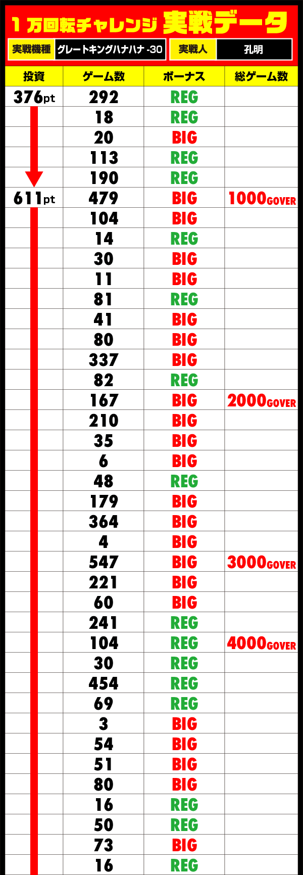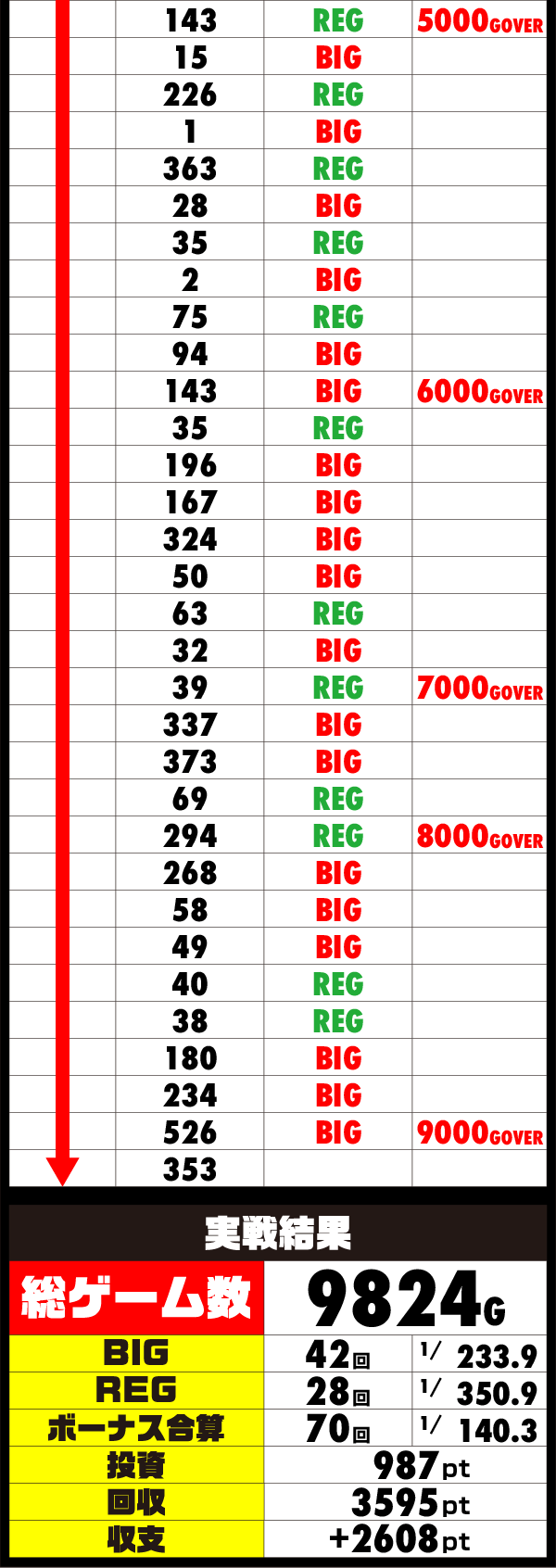 最後に500Gの微妙なハマリでラストスパートをかけるも、176Gを残してタイムアップ。ボーナスの連打がチャレンジ成功の道を阻む結果となった。