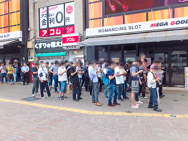 開店前から約80人のプレイヤーが集結。各人、入店の時刻が来るのを心待ちにしているようだった。