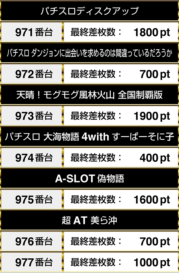 最終的には『パチスロディスクアップ』や『天晴!モグモグ風林火山 全国制覇版』など、合計で7機種が連なってプラスpt!!