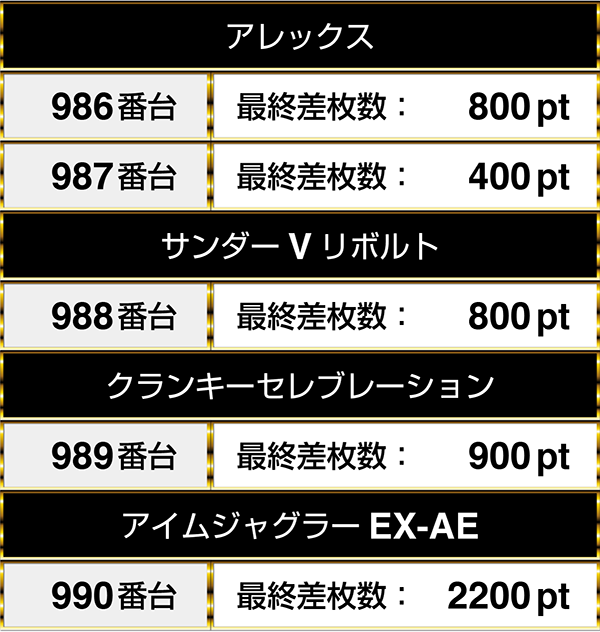 『アレックス』から『アイムジャグラーEX-AE』まで、5台が固まってプラスptとなる場所もあった。