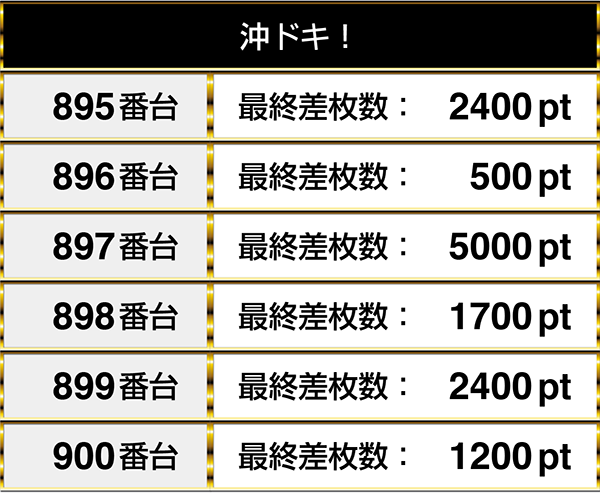 『沖ドキ!』の6台が連なってプラスptを記録し、そのうちの3台は2000ptオーバー!!