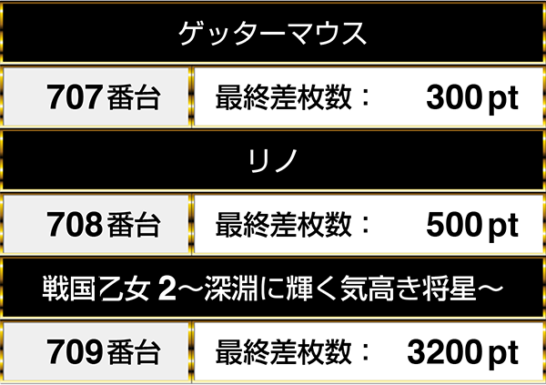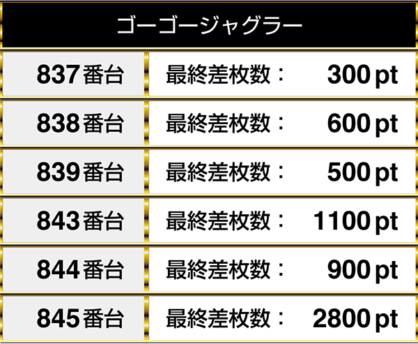 また、パチスロで最多の設置台数を誇る『ゴーゴージャグラー』には、3台並びでプラスptとなる場所が2箇所あった。