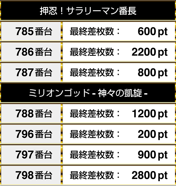 『ミリオンゴッド-神々の凱旋-』も3台が並んでプラスptを記録!
