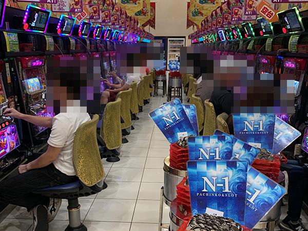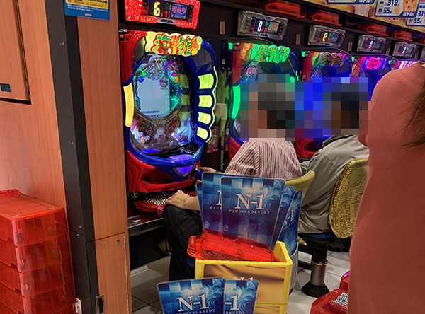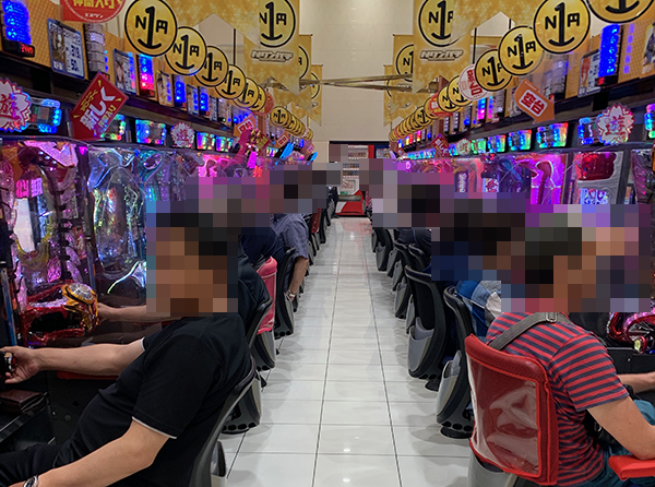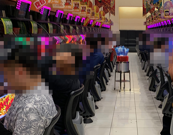 20円パチスロと5円パチスロのどちらにおいても、プレイヤーたちはうれしそうな表情でレバーを叩いていた。
