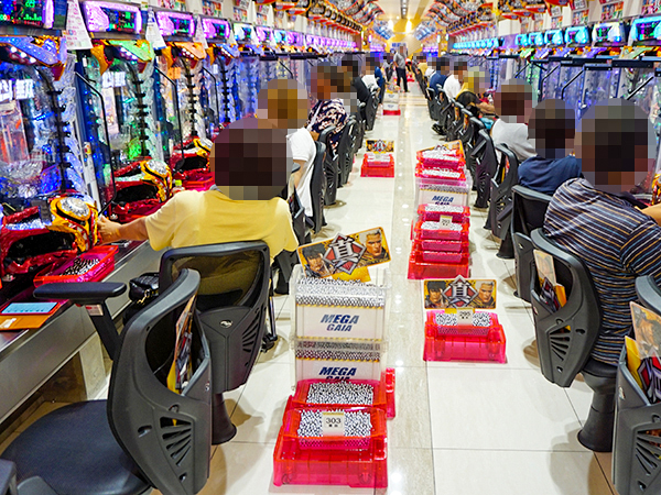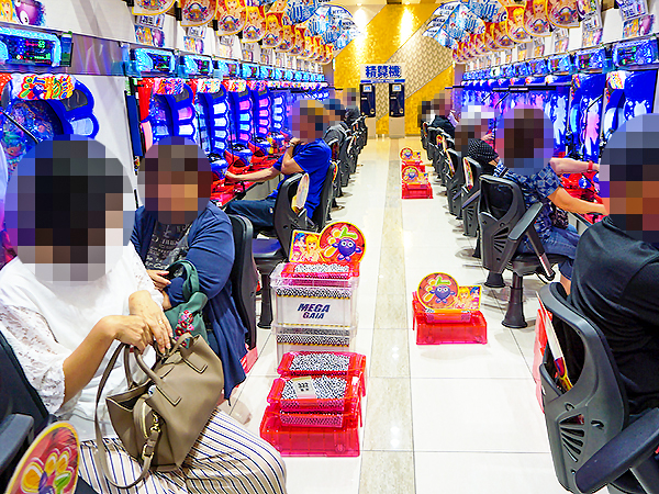 14時過ぎの4円パチンコでは「ぱちんこCR真・北斗無双」や「CR大海物語4」が活況。プレイヤーの活躍をあちこちで目にしている。