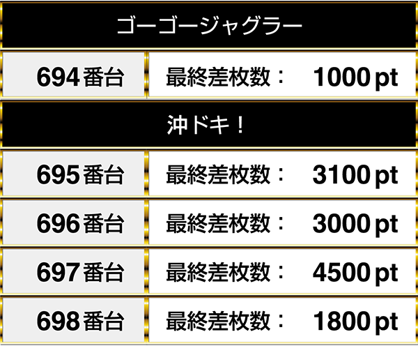 『沖ドキ!』や『ミリオンゴッド-神々の凱旋-』など、さまざまな場所にプラスptのデータが並んでいた。