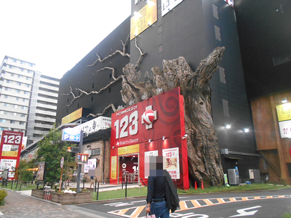 豊洲駅を出て東雲橋を渡っていくと、舞台となった「123+N東雲店」に到着。黒を基調とした外観に大きな木のオブジェが施されており、ホールはとてもインパクトがある。周囲にさまざまな高層ビルが立ち並んでいるが、とくに目立っていたことを覚えている。