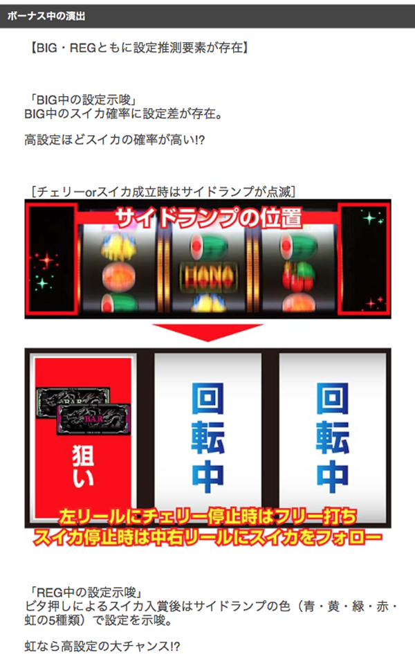 また、ボーナス終了時の龍玉ランプの色でも設定を示唆する。