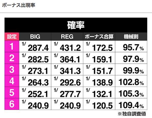 設定推測の軸となるのはボーナス確率。とくに設定差が大きいREG確率に注目したい。