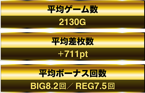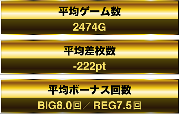 2428Gを消化してBIGとREGを9回ずつ獲得と、ボーナス確率がすべて設定6の近似値となる台もあった。