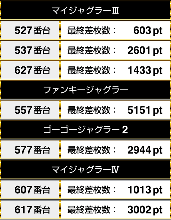 ほかにも、『マイジャグラーⅢ』の537番台や『ゴーゴージャグラー2』の577番台など、ジャグラーシリーズの多数の台がプラスptを記録!!