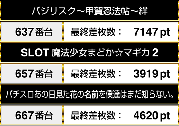 667番台の『パチスロあの日見た花の名前を僕達はまだ知らない。』と657番台の『SLOT魔法少女まどか☆マギカ2』は3000ptオーバー。