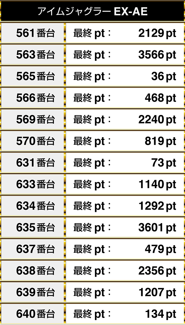 『アイムジャグラーEX-AE』は20台中14台がプラスptとなり、そのうちの5台は2000ptオーバー!