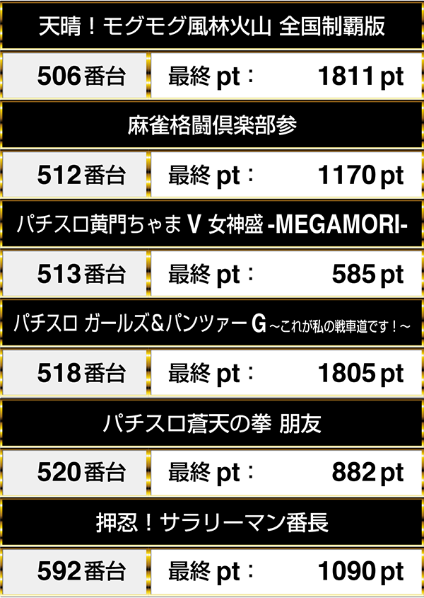 『麻雀格闘倶楽部参』や『押忍!サラリーマン番長』などを含めて、複数の台が1000ptを上回る!!