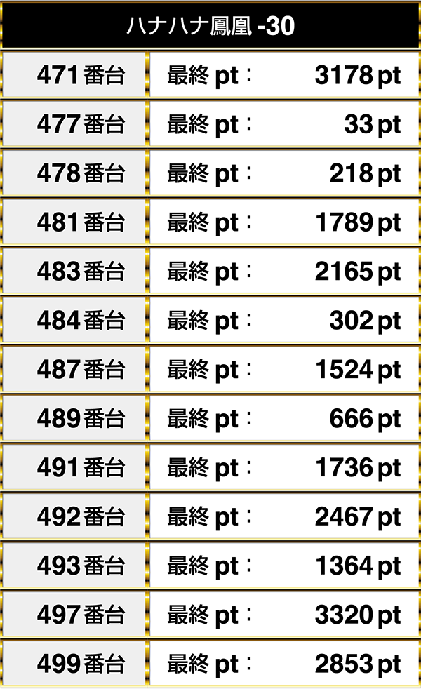 閉店時のデータでは12台中6台がプラスptとなり、そのうちの2台は3000ptオーバー!!