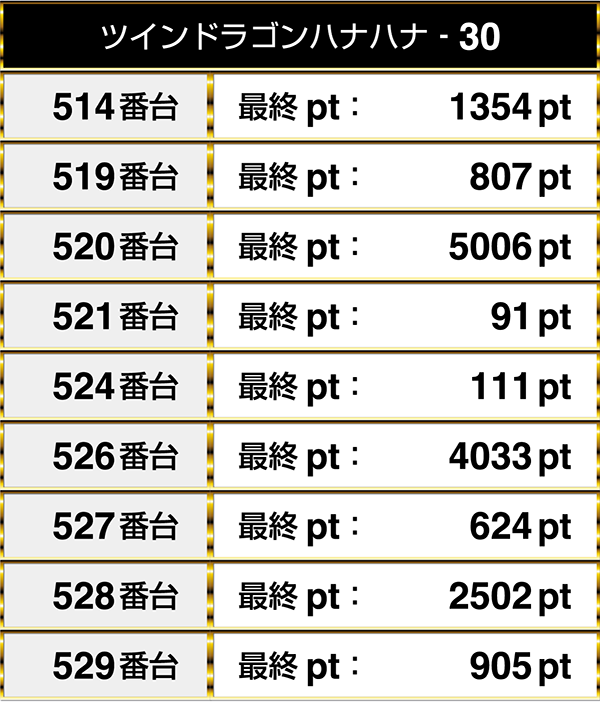 『ハナハナ鳳凰-30』と『ツインドラゴンハナハナ‐30』は4割以上の台がプラスptを記録し、どちらの機種にも3000ptを上回るデータがあった。
