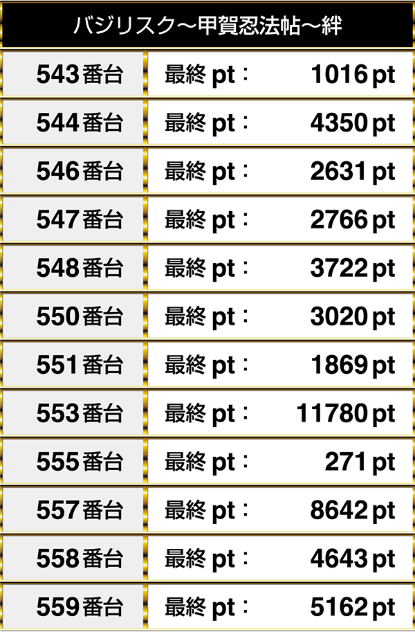 半数以上の台がプラスptでこの日を終えていた『バジリスク~甲賀忍法帖~絆』には、10000ptを上回るデータもあった。