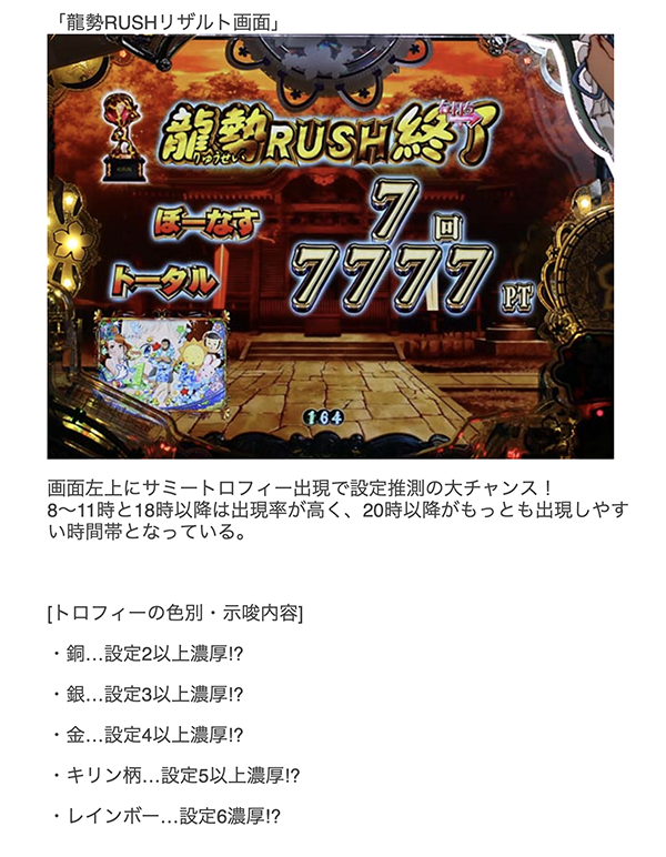 おなじみの推測要素であるサミートロフィーの出現タイミングは龍勢RUSHのリザルト画面で、時間帯によって出現率が変わる。