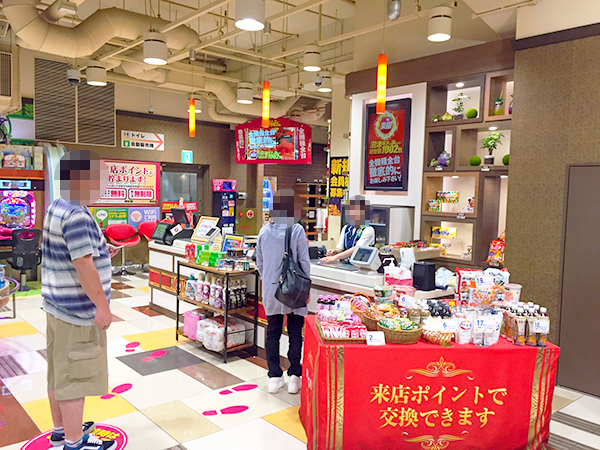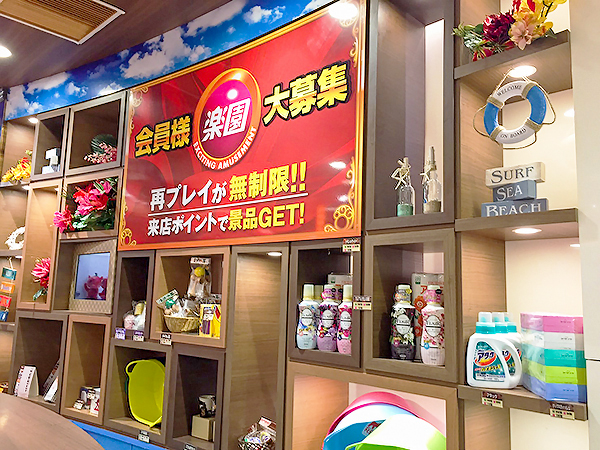 景品コーナーには来店ポイントで交換できるアイテムも並んでおり、そのラインナップの豊富さにプレイヤーは興味をそそられていた。