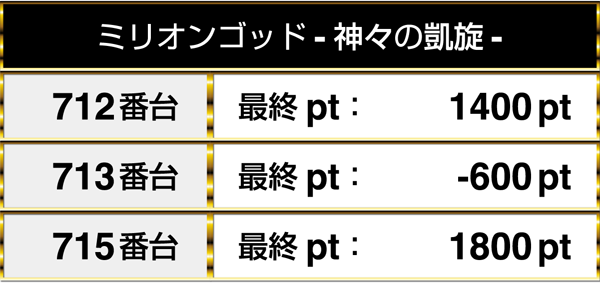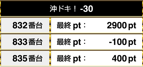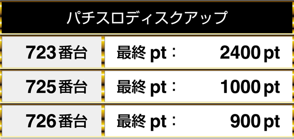最終的には3000pt以上のデータを含め、4台が並びでプラスptを記録。トータルでみても、5台中4台がプラスptでこの日を終えていた。