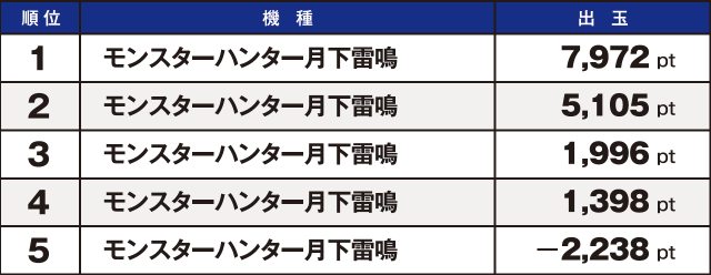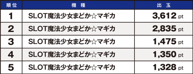 最終データを見ると『月下雷鳴』は約8千pt弱、5千pt超と怪記録が続出。また『まどマギ』は全台で千〜3千pt超の差枚ptを叩き出す安定データを記録し、プレイヤーを喜ばせていた。