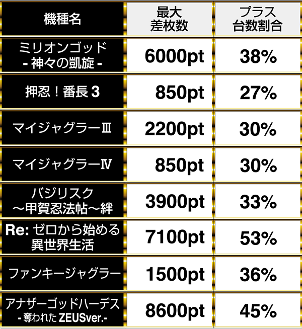 10台以上設置の機種で、プラスptが半数以上であったのは『SLOT魔法少女まどか☆マギカ』と『Re:ゼロから始める異世界生活』。どちらも8台以上がプラスptとなっていた。