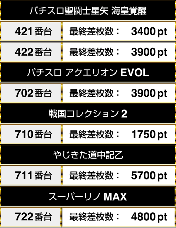 設置台数が少ない機種にもプラスptがいくつもあり、『やじきた道中記乙』と『スーパーリノMAX』が4000pt以上を記録!