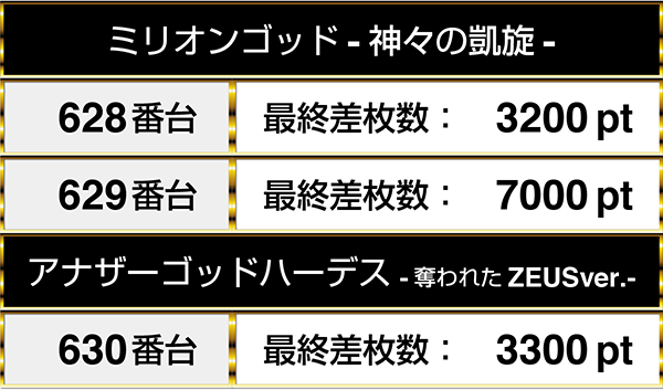 となりに設置されている『アナザーゴッドハーデス-奪われたZEUSver.-』を通すと、3台並びでプラスptとなっていた。