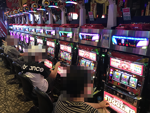 『ゴーゴージャグラー2』や『スーパーミラクルジャグラー』などでプレイヤーが楽しそうに遊技をおこなっており、伝わってくる雰囲気はとても華やか。