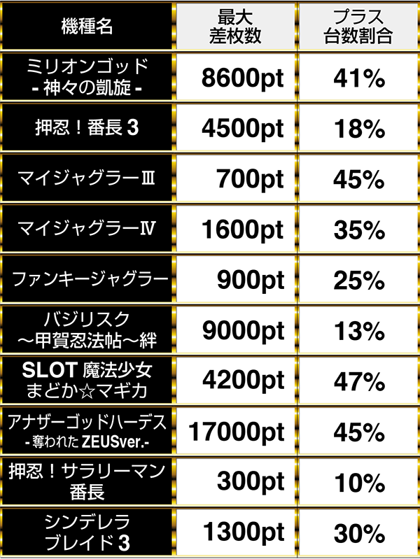 『SLOT魔法少女まどか☆マギカ』や『ミリオンゴッド-神々の凱旋-』なども4割以上の台がプラスptでこの日を終えていた。