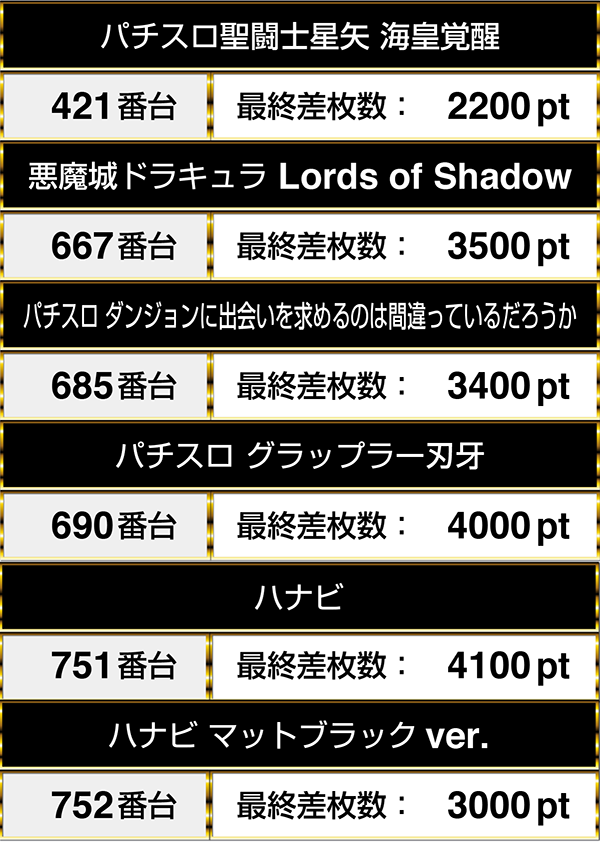 『パチスロ ダンジョンに出会いを求めるのは間違っているだろうか』は3000ptを上回り、『ハナビ』は4000pt以上を記録していた。