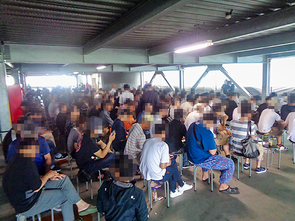 開店前から約600人ものプレイヤーが集合。会話を楽しみながら入店を待つ、実に和やかなシーンを目にしている。