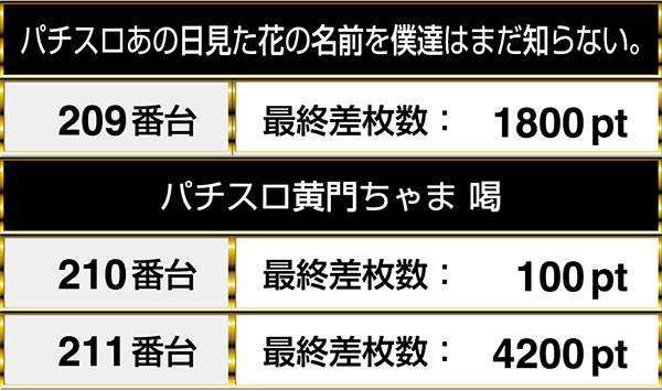 新台の『パチスロあの日見た花の名前を僕達はまだ知らない。』と『パチスロ黄門ちゃま 喝』は機種を通して、3台並びでプラスptを記録!