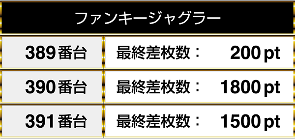 人気を集めていた『ファンキージャグラー』にも3台が連なりながらプラスptを記録する場所があった。