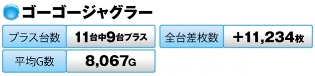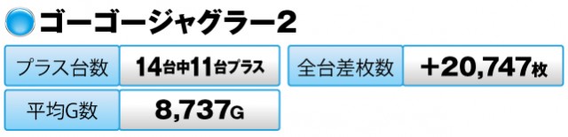 『ゴーゴージャグラー2』が14台中11台がプラスで全台差枚数が+20,747枚、『ゴーゴージャグラー』が11台中7台がプラスで全台差枚数は+11,234枚を記録した。