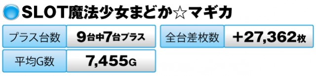 9台中7台がプラスで全台差枚数は+27,362枚を記録した。