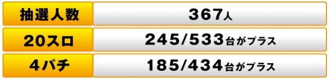 パチスロ全体では533台中245台がプラスで、トータルの差枚数は+65,988枚という素晴らしい結果だった。