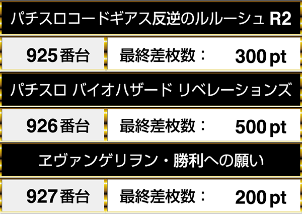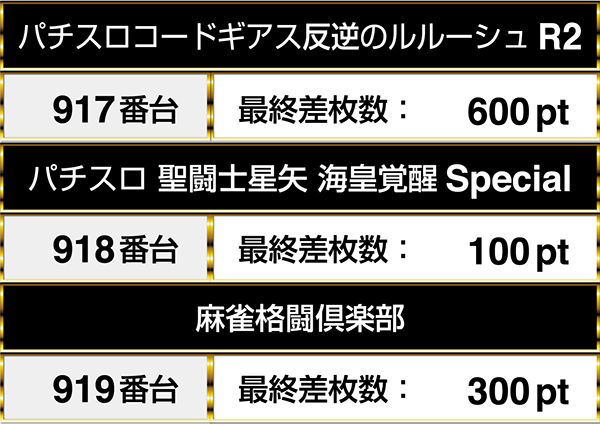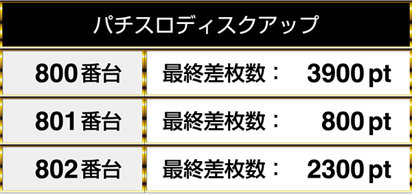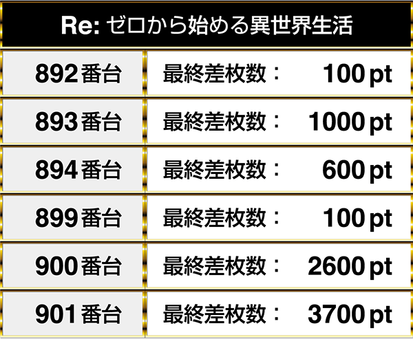 892番台から894番台、899番台から901番台までが最終的にプラスptを記録し、なかには3000ptを上回る台もあった。