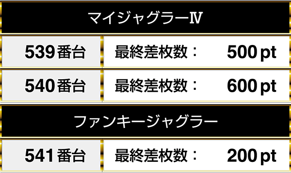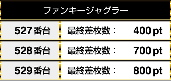 最終的には『ファンキージャグラー』の3台が並んでプラスptを記録。『マイジャグラーⅣ』と並びながら3台にわたってプラスptとなっている場所もあった。