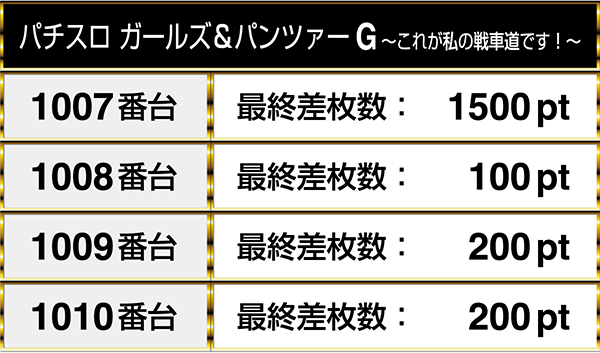 『パチスロ ガールズ&パンツァーG~これが私の戦車道です!~』においては、4台が固まってプラスptを記録!