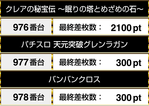 閉店時には『クレアの秘宝伝 ~眠りの塔とめざめの石~』から『バンバンクロス』までの3機種が並んでプラスptを記録していた。