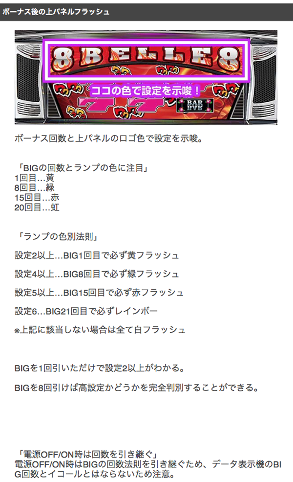 BIGの回数と上パネルのロゴの色に注目。8回目と15回目、21回目のBIGに高設定濃厚パターンが存在する。