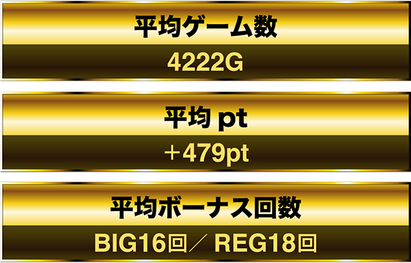 最終的な平均ゲーム数は4222G、平均ボーナス回数は34回であった。