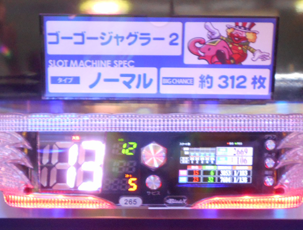 データカウンターをチェックすると、総ゲーム数が2669Gで25回のボーナスに当選している台を確認。ボーナス合算確率は1/106となり、設定6の数値を上回っていた。