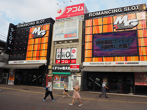 オレンジ色を基調とした外観には、機種の映像が流れる大きなモニターが備えられている。みためにインパクトがあり、周辺に立ち並んでいる、さまざまなお店のなかでもひときわ目立っていた。