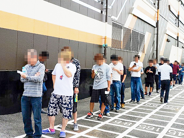 開店前から約60人のプレイヤーが集合。会話を楽しみながら入店を待つ、実に和やかなシーンを目にしている。
