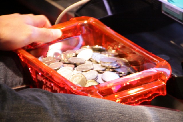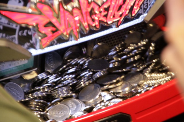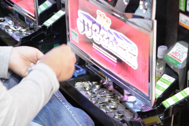 スロットコーナーでもジャグラーが火を噴く勢いでメダルがヂャラヂャラ、こんもりたまったメダルを鷲掴みにしてほくそ笑むファンの雄姿がそこここに!