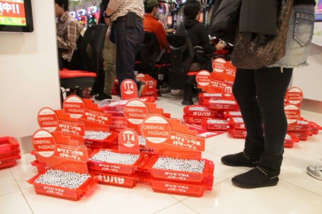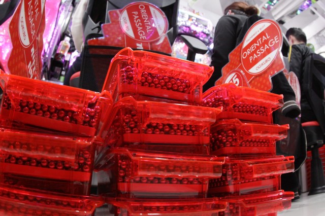 否!一部遊パチや1パチは各台計数機だが玉積みありの4円パチンコエリアにはまるで絨毯のようにふっくらとした出玉の草原が横たわる。