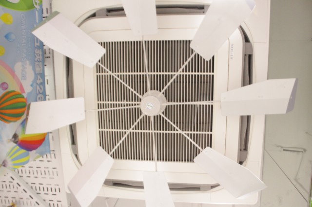 天井のビルトインエアコンには空気を攪拌し、効率を上げる「ハイブリットファン」や島上、島横には植栽等見事なエコっぷり。